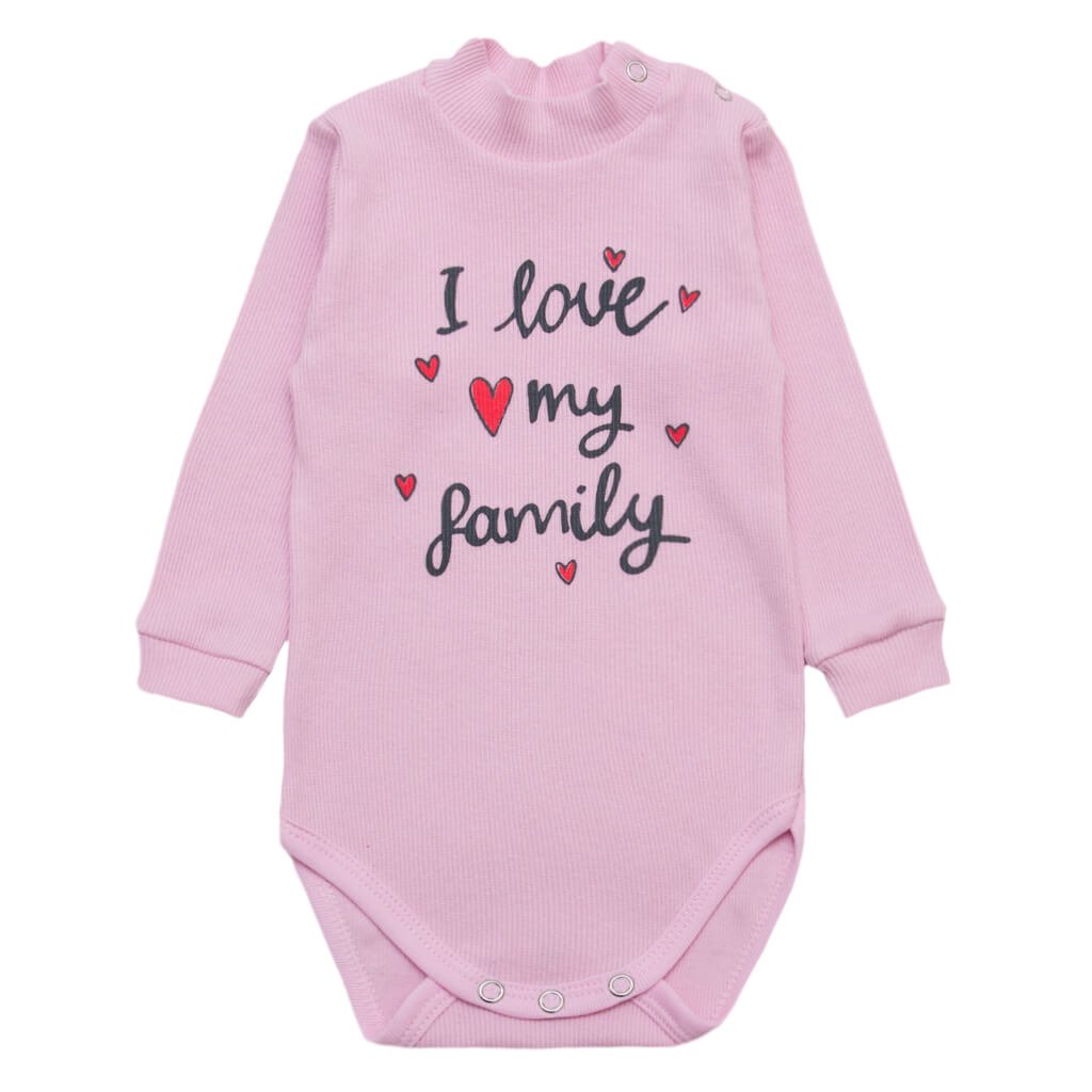 Боді-гольф для дівчинки пошитий з якісного рубчикового полотна світло-рожевого кольору. Полотно досить щільне, та в той же час еластичне. Виріб добре показує себе під час використання, легко переться та швидко висихає. Горловина-стійка щільно захищає шийку від протягів. На одному плечику є кнопочки, це дуже спрощує та прискорює переодягання малюка. В нижній частині бодік також застібається на кнопки. На рукавах манжети з основного полотна. Прикрасою боді служить милий принт з надписом I love family. У такому боді-гольфі Вашому хлопчику буде тепло та комфортно.