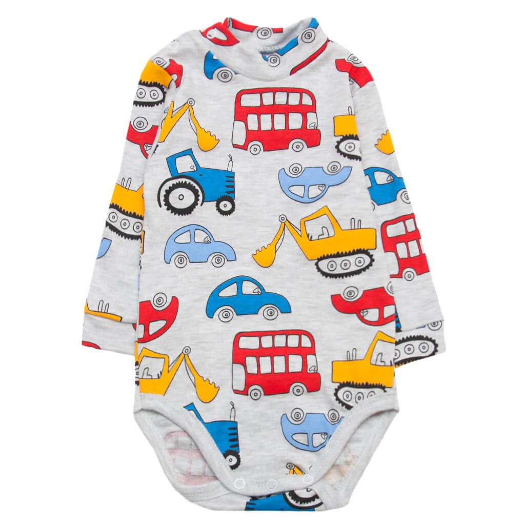 Сірий боді-гольф з машинками для хлопчика виготовлений з натурального, перебуваючого на 100% з бавовни, інтерлочного полотна. Боді зроблений гольфом і щільно закриватиме шию малюка. На одному плечику є кнопочки, що дуже зручно при переодяганні малюка. На рукавцях манжети з основного полотна. Знизу бодік застібається на кнопки і оброблений бейкою. Такий бодік можна з легкістю комбінувати з штанцями або повзунками, які Ви також можете придбати в нашому інтернет-магазині, в розділі "Ясельний трикотаж".