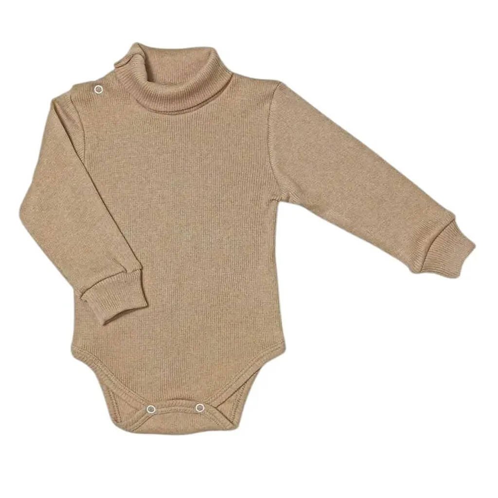 Дитячий боді-гольф із утепленого рубчика з начісом - must have на прохолодну пору року. Такий бодік у світло-коричневому кольорі підійде на прохолодну осінь та весну, а також на зиму, оскільки зсередини утеплений начісом. Тканина дуже еластична, добре розтягується та зберігає початкову форму. Горловина висока, можна підкотити і не переживати за те, що дитина замерзне. Збоку на плечику є кнопки, тому процес одягання не буде складним. Ми рекомендуємо запастися великою кількістю таких дитячих боді з довгим рукавом, адже вони є базою будь-якого образу дитини.
