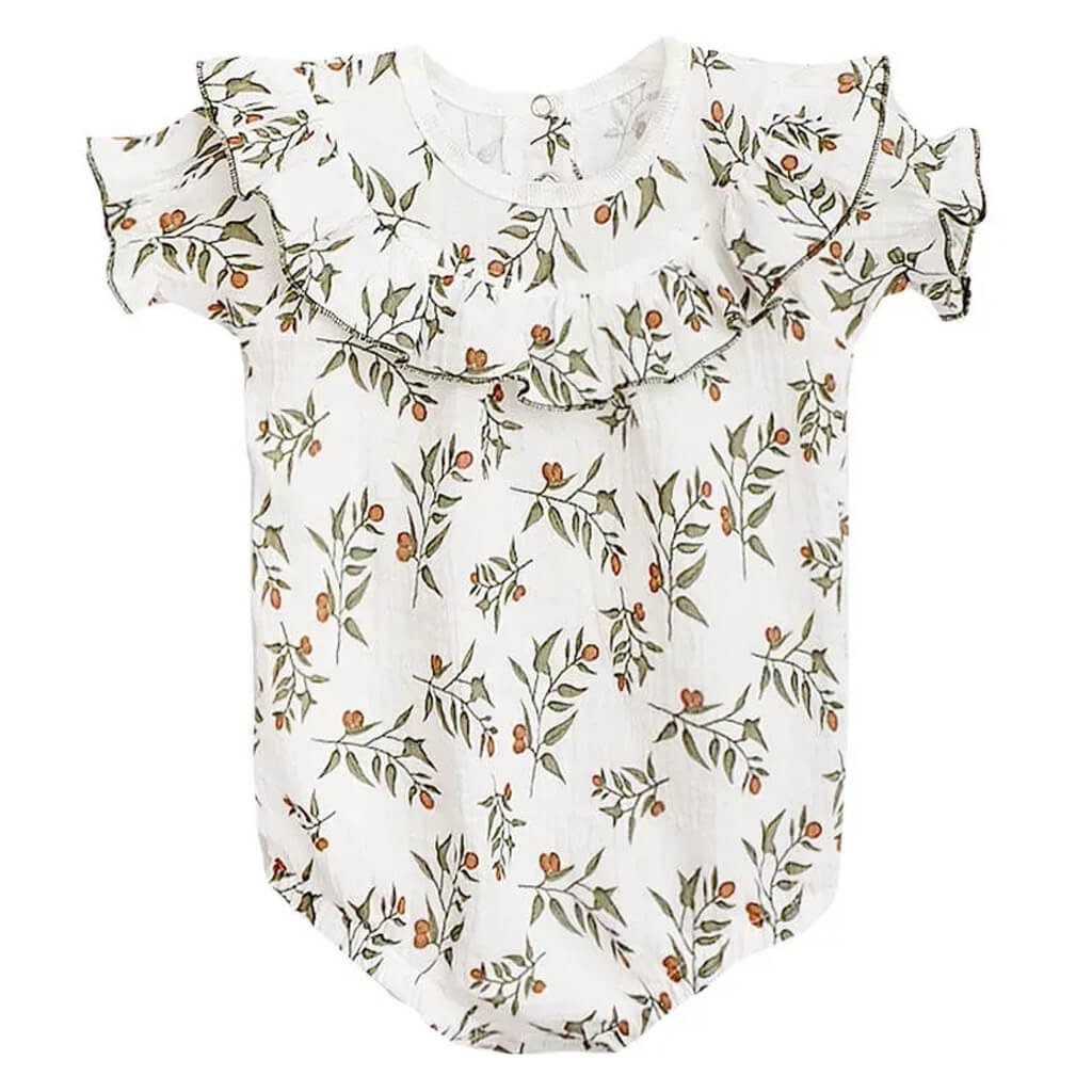 Боді для дівчинки з принтом оливи виготовлено з м'якого і дихаючого мусліну, який вирізняється відмінною повітропроникністю. Цей легкий і комфортний матеріал ідеально підходить для теплих літніх днів, створюючи відчуття легкості та зручності під час носіння. На спинці передбачені кнопочки, які полегшують процес одягання і знімання, що особливо зручно для батьків. Зручний і стильний дизайн боді доповнений декоративними рюшами, розташованими біля горловини. Еластична резинка по низу і на рукавах забезпечують відмінну посадку і не сковують рухи. Цей боді стане чудовим вибором для маленьких дівчаток, забезпечуючи не тільки стильний, але й зручний зовнішній вигляд.