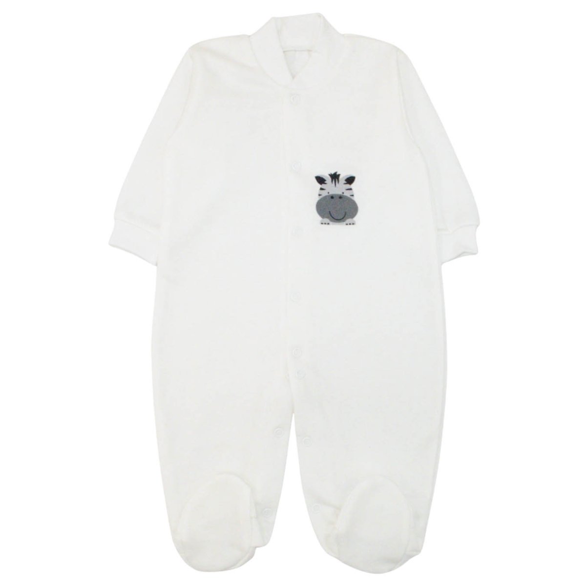 Чоловічок дитячий, молочного кольору з малюнком зебри, пошитий з натурального полотна з начісом, буде ідеальним вбранням. По всій довжині виробу є кнопки, на які й застібається чоловічок, це дозволяє швидко, з легкістю переодягати маля. Комір зроблений стійкою з еластичного манжета, на рукавах також є манжети, ніжки закриті. Однотонні кольори доповнюють красиві, яскраві й веселі забарвлення спереду чоловічка, на одній з поличок. Підберіть потрібний Вам розмір, колір і зробіть замовлення в нашому інтернет-магазині. Вашому малятку буде зручно та комфортно в такому чоловічку, це ми гарантуємо!