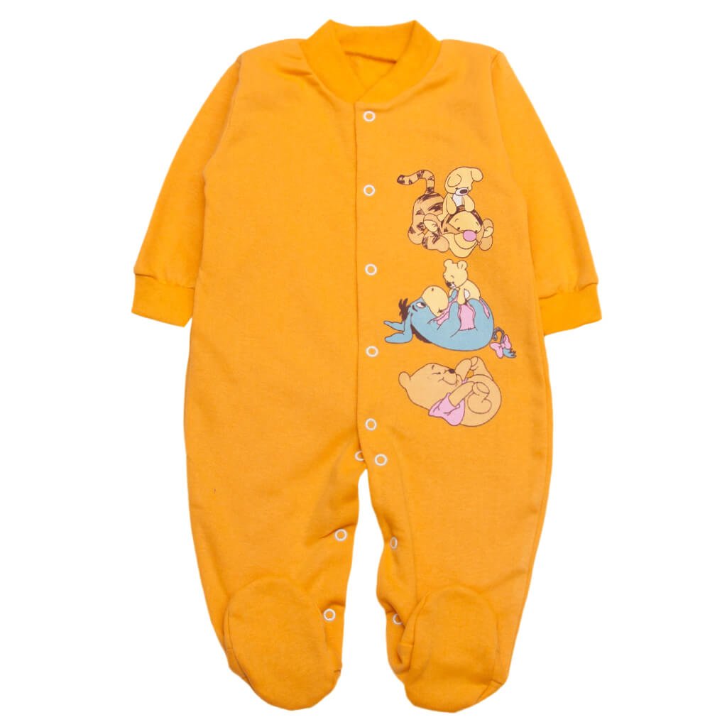 Чоловічок дитячий, гірчичного кольору, принт звірята, виготовлений з бавовняного полотна начіс. Якщо правильно доглядати, виріб з такого полотна довго радуватимуть своїм первинним виглядом. Полотно після прання не сідає, добре зберігає форму та колір, легко прасувати. Ця модель чоловічка дуже зручна у використанні, від коміра до п'ят на чоловічку є кнопочки, що полегшує та прискорює переодягання малюка. На комірці й рукавах є манжети. На одній з поличок чоловічок прикрашений красивим малюнком, який точно не залишить Вас байдужими.