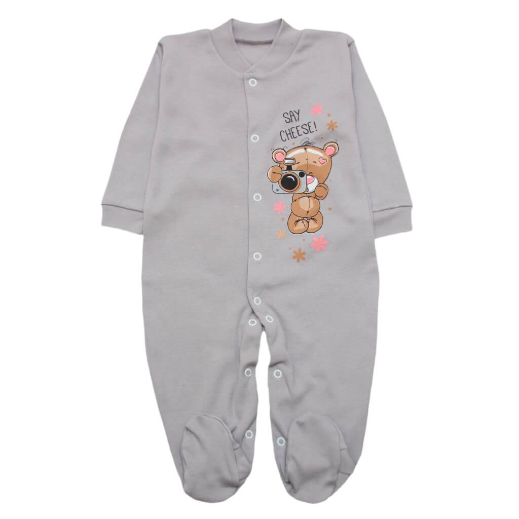 У нашому інтернет-магазині новинка - спальник для малюків, сірого кольору з малюнком ведмедика . Чоловічок пошитий з натурального бавовняного інтерлочного полотна. Полотно м'яке і приємне до тіла, а натуральний склад полотна дозволить шкірі немовляти дихати. Від горловини і до самих п'ят спальник застібається на кнопочки, що дуже полегшує процес переодягання дитини. Комір зроблений стійкою, на рукавах манжети. Родзинкою сліпу є дуже миле фарбування спереду виробу. У такому спальнику Вашому карапузові буде комфортно і затишно.