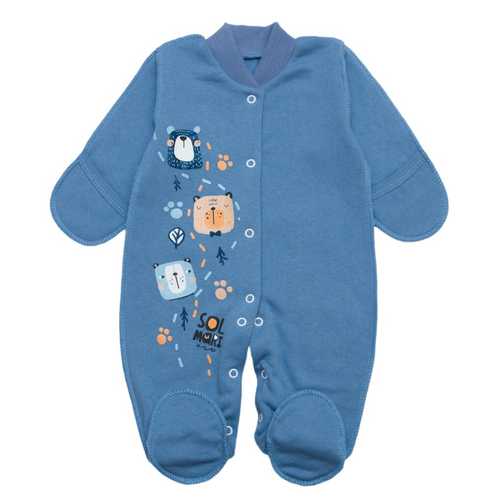 Цей дитячий чоловічок, блакитного кольору з принтом ведмедиків, пошитий з натурального однотонного полотна з начісом. Модель зручна й комфортна для немовляти. Від коміра до п'ят чоловічок застібається на кнопочки, що дуже зручно при переодяганні карапуза. Ніжки закриті, це теж дуже зручно, та не вимагає додатково одягати на ніжки шкарпеточки. Рукави зроблені кишеньками, які можна відкривати або закривати. Шви зроблені на виворіт. Красиві кольори чоловічків доповнені яскравими малюнками. ТМ "Арлекін" робить тільки якісні речі для Ваших діток.