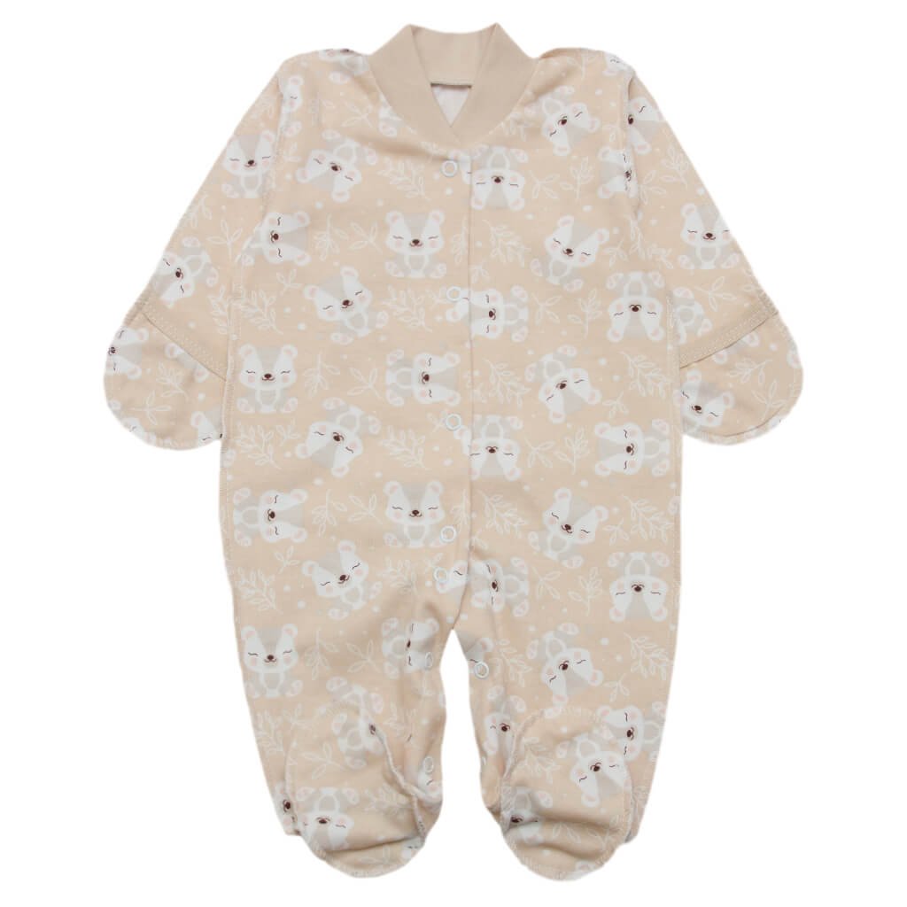 Чоловічок дитячий бежевого кольору виготовлений з натурального інтерлочного полотна. Модель дуже зручна та практична у використанні. Чоловічок має кнопки по всій довжині, на які й застібається, що дозволяє легко одягати і роздягати малюка. Рукави зроблені у вигляді кишеньки, можна відкривати ручки, ніжки закриті, на комірі манжет. Шви в чоловічку пошиті на виворіт, малюкові нічого не заважатиме і не давитиме під час сну. А гарний принт єнотів на виробі радуватимуть маму та близьких людей.