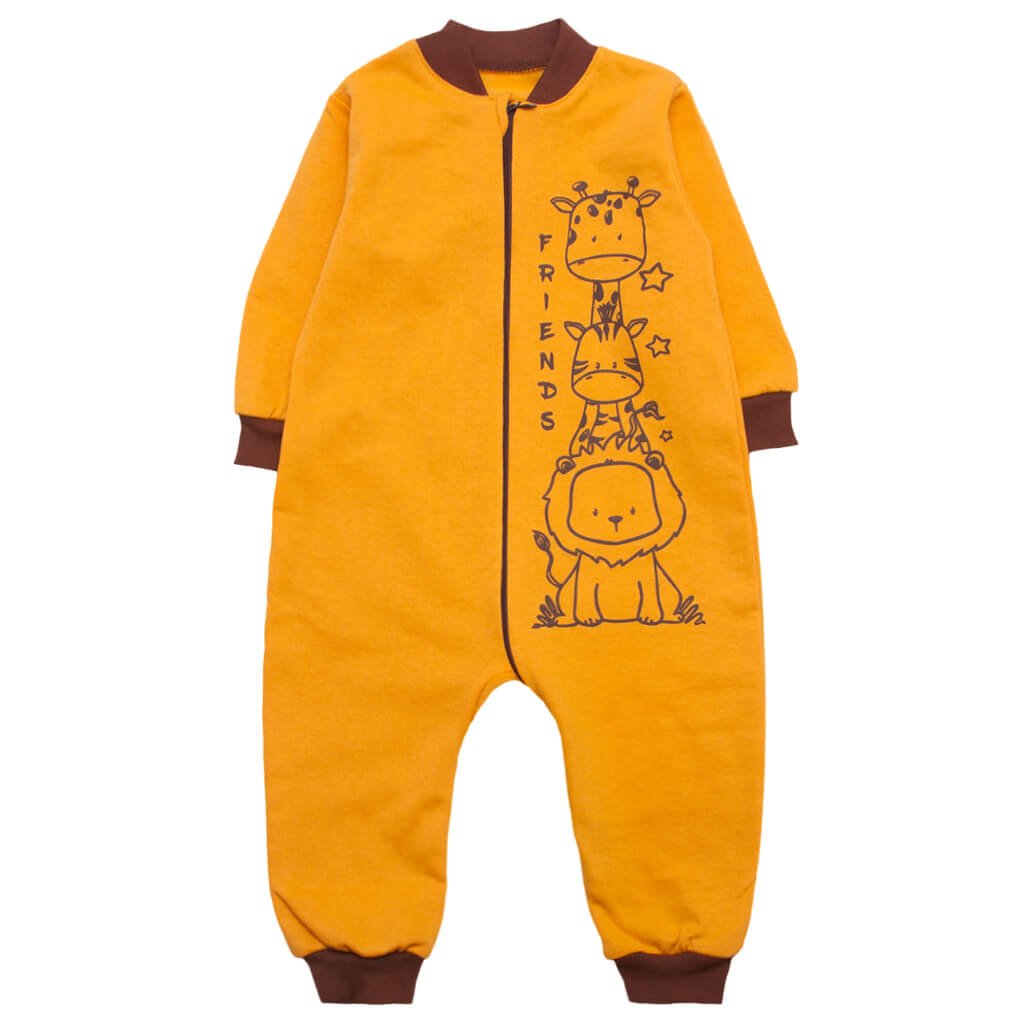 Шукаєте своєму малюкові теплі дрібнички на холодний сезон? Тоді ми можемо Вас порадувати, адже Ви перейшли на потрібний інтернет-магазин дитячого одягу. Саме наша торгова марка «Арлекин» підготувала чудові теплі новинки для своїх маленьких клієнтів. Комбінезони ніколи не перестануть бути актуальними. Такий вид дитячого одягу дуже зручний та практичний. Представлена модель чоловічка, гірчичного кольору, пошита із високоякісного начосу. По краях виробу присутні манжети. Комбінезон застібається на блискавку спереду. А як доповнення виступає невелике миле фарбування.