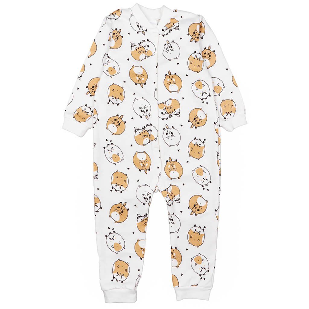 Ясельний ромпер молочного кольору з принтом хом'ячка для хлопчика та дівчинки - популярний одяг серед вибору матусь, оскільки це дуже зручно. Попереду від горловини до низу підгузка розташовані кнопки, тому процес переодягання дитини не буде складним. Ромпер із відкритими ручками та ніжками, та можна самостійно коригувати рівень утеплення дитини та одягнути махрові або звичайні дитячі шкарпетки за необхідності, які Ви також можете придбати в нашому інтернет-магазині. Дана модель є утепленою начісом, а отже чудово підійде на холодну пору року.