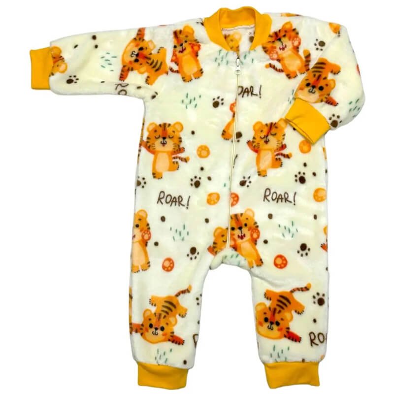 Махровий комбінезон – зручний предмет дитячого гардеробу на прохолодний сезон. У таких теплих комбінезонах малюк може вільно та зручно пересуватися. До вашої уваги представлена нова модель молочного дитячого чоловічка із зображенням тигренят. Виріб виготовлений з високоякісної махри. Полотно дуже м'яке і приємне на дотик. Ручки та ніжки у даної моделі відкриті та оброблені еластичними манжетами. Чоловічок застібається на блискавку, яка розташована посередині виробу. Такий комбінезон підійде як домашній одяг, так і як одяг для прогулянок на свіжому повітрі.