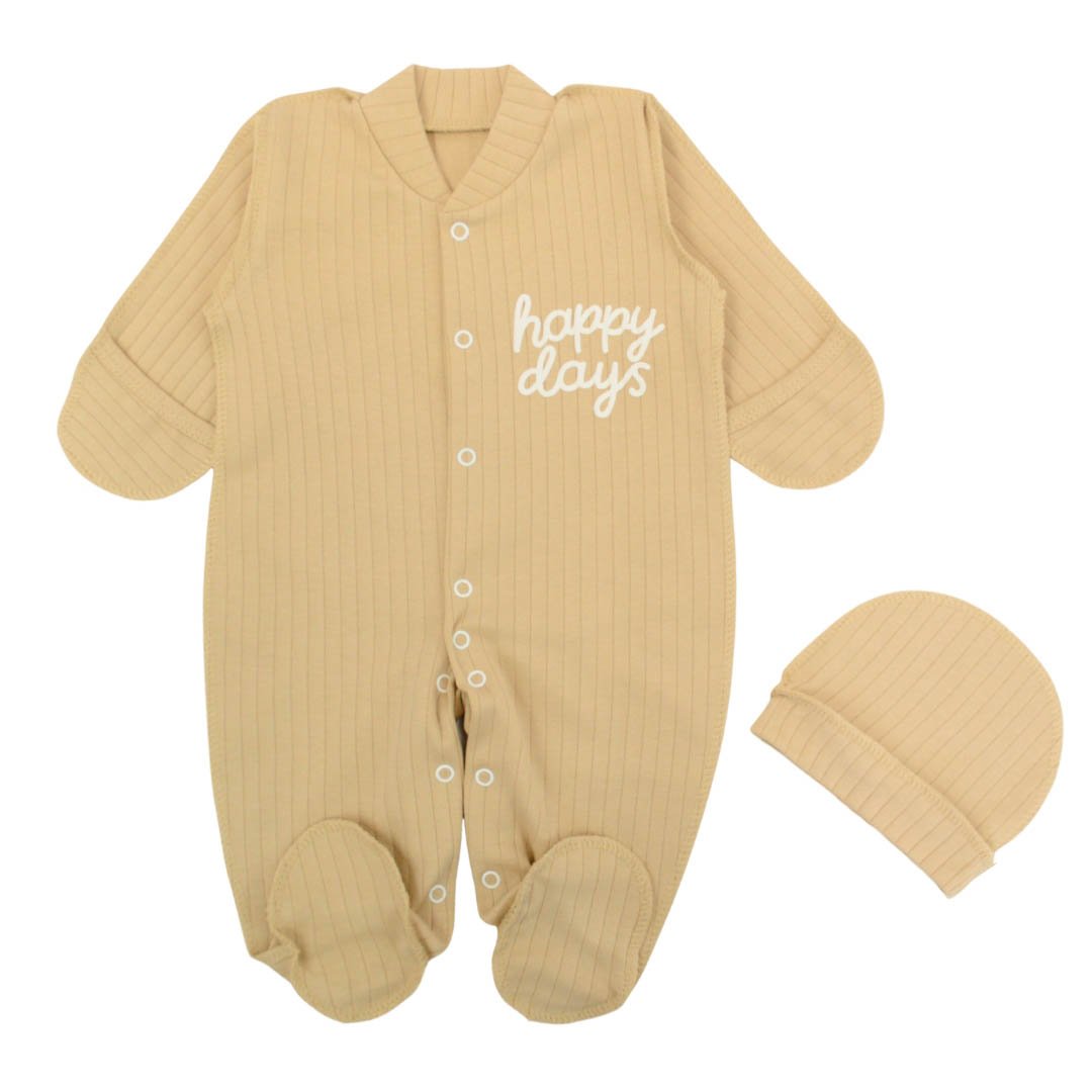 Коли йдеться про перший одяг для малюка, важливими є не тільки зручність і практичність, а й м'якість тканини, яка торкатиметься ніжної шкіри. Цей чарівний комплект бежевого кольору з написом Happy days з чоловічка і шапочки створений спеціально для найменших, забезпечуючи їм тепло і комфорт у будь-яку пору року. Полотно інтерлок рапорт приємне на дотик, добре зберігає форму після прання і не викликає подразнення на ніжній шкірі дитини. Чоловічок виконаний зі зручними кнопками по всій довжині, що полегшують процес переодягання. Манжети трансформуються у рукавиці-антиподряпки, що особливо корисно для новонароджених. Шапочка з тієї ж тканини дбайливо закриває голівку малюка, захищаючи його від протягів і холоду.