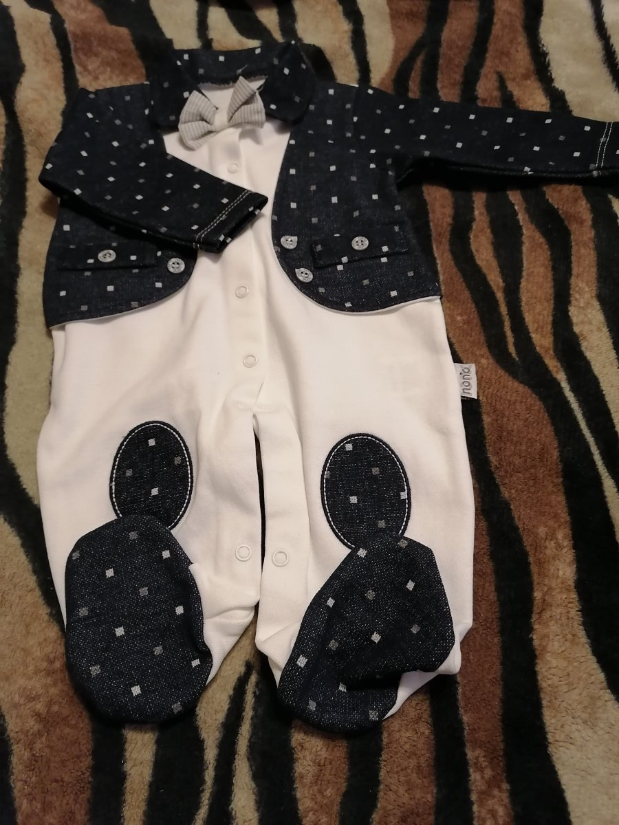 Кілька нових неймовірно стильних моделей дитячих комбінезонів обов'язково повинні поповнити і урізноманітнити гардероб Вашого малюка. Дана модель дитячого чоловічка, темно-синього кольору, ідеально підійде для справжніх маленьких джентльменів. Виріб пошито з двох видів високоякісного полотна: однотонного інтерлоку та котону з малюнками. Головна особливість представленого комбінезона в тому, що дизайн виконаний у вигляді костюма з метеликом. Такий зовнішній вигляд чоловічка точно сподобається багатьом батькам. Також ніжки у даного вироба закриті.
