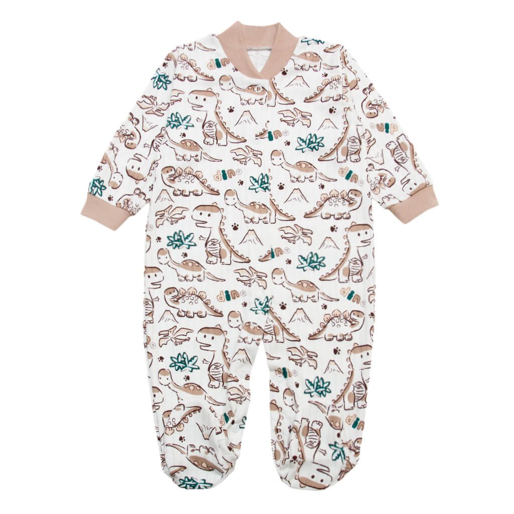 Дитячий чоловічок пошитий з якісного трикотажного матеріалу - інтерлок рапорт з малюнками бежевих динозавриків. Це натуральна, щільна і приємна на дотик тканина, яка ідеально підходить для чутливої шкіри дитини. Вона забезпечує хорошу терморегуляцію, даючи змогу малюкові почуватися комфортно як вдома, так і на прогулянці. Особливість цієї моделі полягає у відкритих ручках і закритих ніжках. Такий дизайн робить чоловічок ідеальним варіантом для активних малюків. Розміри підходять для дітей зростом від 68 см до 80 см, що робить цю модель чудовим вибором для малюків віком від кількох місяців до року. Завдяки зручним кнопкам, які розташовані вздовж виробу, процес одягання і переодягання дитини стає швидким і комфортним.