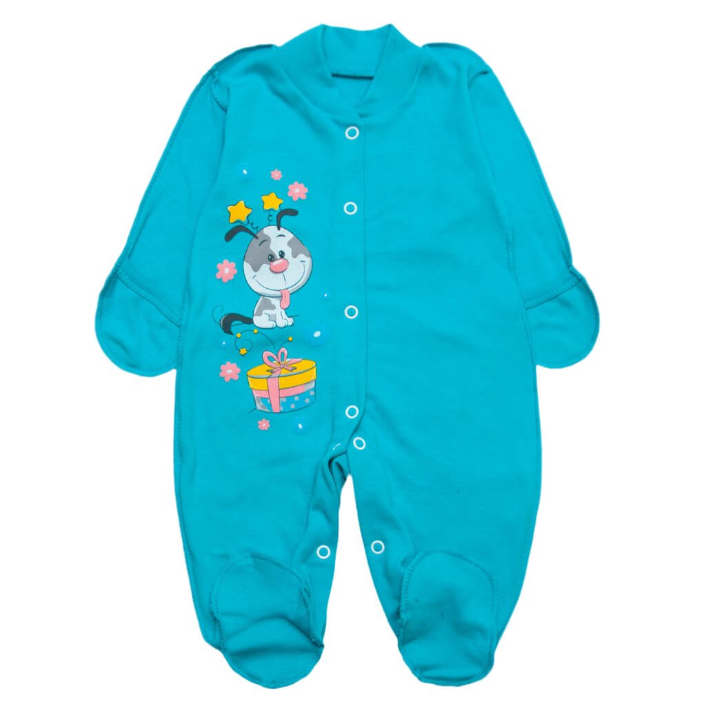 Чоловічок для дитячий, бірюзового кольору малюнок собачка, пошитий з інтерлочного полотна начіс бірюзового кольору, тому дуже теплий. Тканина м'яка і приємна. Комірець зроблений стійкою з еластичного манжету. Це миле вбрання застібається кнопочками по всій довжині, від верху до низу, це набагато спрощує одягання малюка. На рукавах кишеньки, можуть бути відкриті або закриті. Тканина після прання не сідає, не стягується та не втрачає колір. Чоловічок з одного боку прикрашений милим малюнком. Вашому малюку буде тепло й затишно в такому чоловічку. Приємних покупок і гарного настрою, ТМ Арлекін!