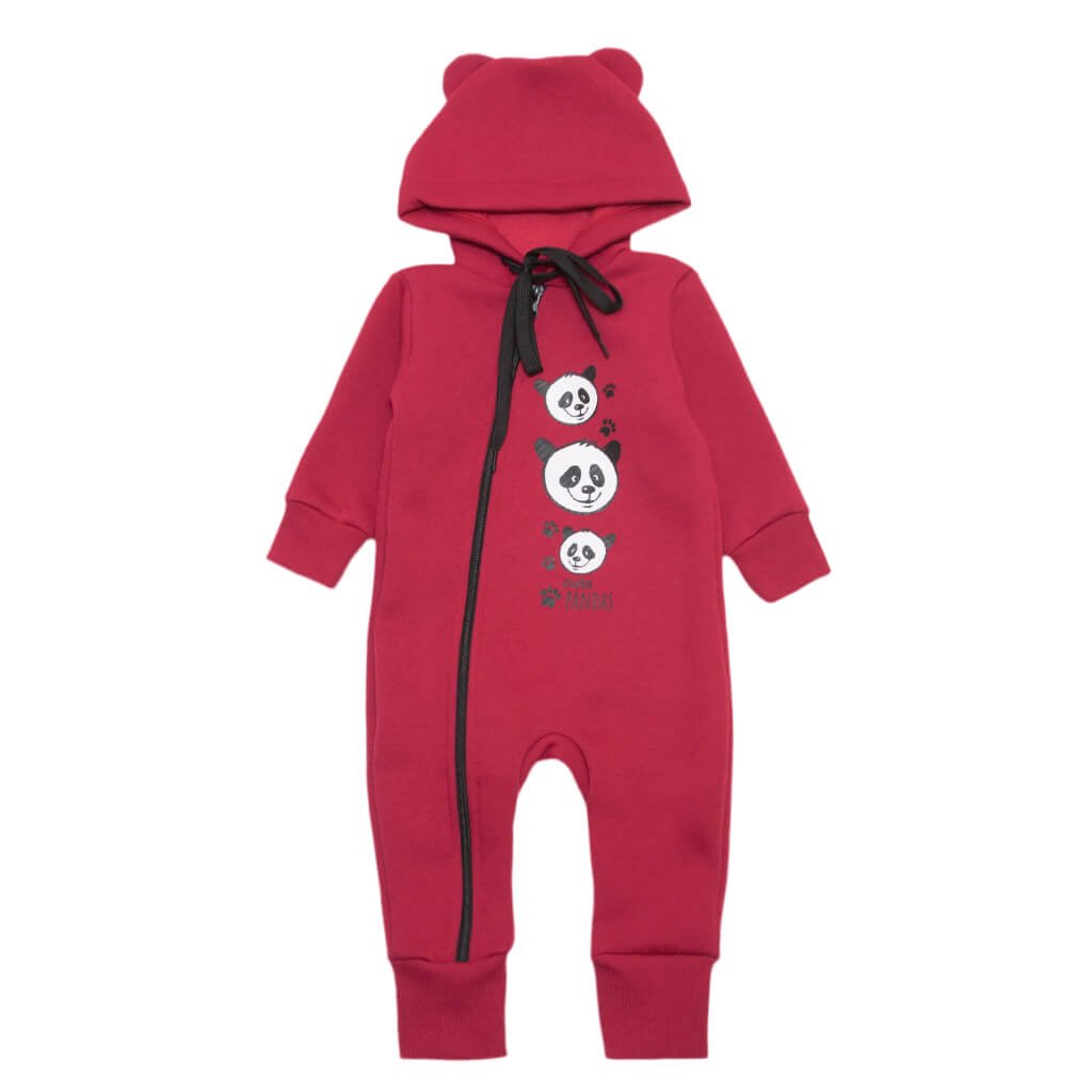 У холодну пору року дуже важливо приділити увагу гардеробу дитини. При низькій температурі повітря та сильних вітрах одяг дитини повинен бути утеплений. Трьохнитка з начісуванням - це чудове полотно, практично на 100% складається з бавовни. Теплий комбінезон, бордового кольору з малюнком пандочок, з капюшоном виготовлений саме з цього полотна. Дитячий комбінезон - демісезонний та зимовий варіант одягу. Виріб добре тримає форму, не вимагає додаткових зусиль при прасуванні. Спереду навскіс розташована блискавка від самого верху і до низу однієї ніжки. По низу та краю рукавів є стрейчові манжети. Капюшон з вушками і гарненький малюнок виглядають дуже мило, точно сподобаються малюкові.