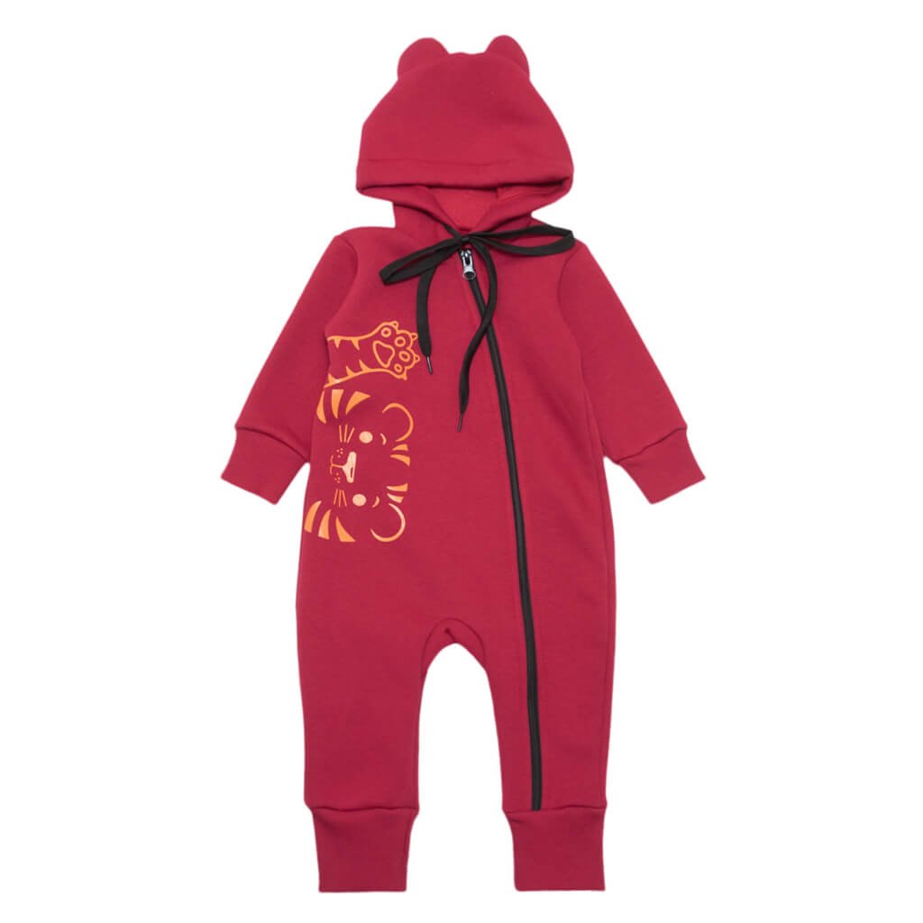 У холодну пору року дуже важливо приділити увагу гардеробу дитини. При низькій температурі повітря та сильних вітрах одяг дитини повинен бути утеплений. Трьохнитка з начісуванням - це чудове полотно, практично на 100% складається з бавовни. Теплий комбінезон, бордового кольору з малюнком тигреня, з капюшоном виготовлений саме з цього полотна. Дитячий комбінезон - демісезонний та зимовий варіант одягу. Виріб добре тримає форму, не вимагає додаткових зусиль при прасуванні. Спереду навскіс розташована блискавка від самого верху і до низу однієї ніжки. По низу та краю рукавів є стрейчові манжети. Капюшон з вушками і гарненький малюнок виглядають дуже мило, точно сподобаються малюкові.