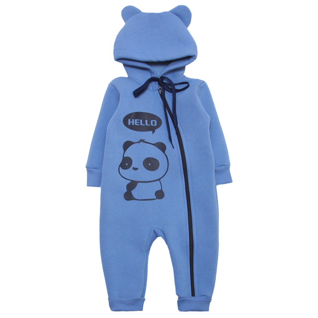 У холодну пору року дуже важливо приділити увагу гардеробу дитини. При низькій температурі повітря та сильних вітрах одяг дитини повинен бути утеплений. Трьохнитка з начісуванням - це чудове полотно, практично на 100% складається з бавовни. Теплий комбінезон, блакитного кольору, з капюшоном виготовлений саме з цього полотна. Дитячий комбінезон - демісезонний та зимовий варіант одягу. Виріб добре тримає форму, не вимагає додаткових зусиль при прасуванні. Спереду навскіс розташована блискавка від самого верху і до низу однієї ніжки. По низу та краю рукавів є стрейчові манжети. Капюшон з вушками і гарненький малюнок виглядають дуже мило, точно сподобаються малюкові.
