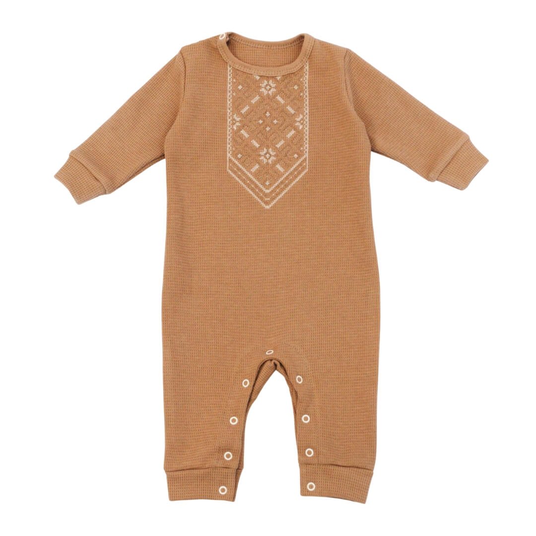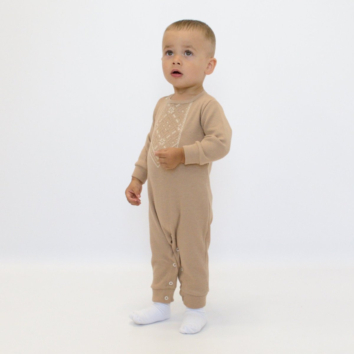 З першого погляду цей дитячий ромпер приваблює своєю продуманою простотою. Виготовлений з м'якого полотна інтерлок вафелька бежевого кольору, яке приємне на дотик, добре пропускає повітря та підходить для ніжної дитячої шкіри. Однотонний колір гармонійно доповнений вишивкою орнаменту на грудях, що надає моделі особливий акцент. Для зручності батьків і малюка передбачені кнопки між ніжок, які дозволяють швидко переодягнути дитину, а також застібки біля горловини. Ромпер представлений в декількох кольорах і легко може стати як повсякденним одягом, так і святковим варіантом для найменших.