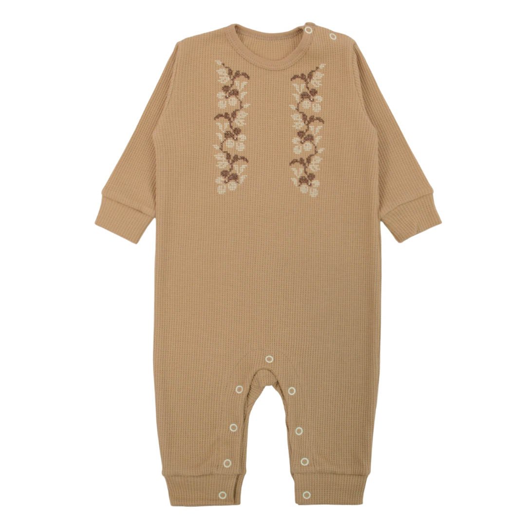 З першого погляду цей дитячий ромпер приваблює своєю продуманою простотою. Виготовлений з м'якого полотна інтерлок вафелька бежевого кольору, яке приємне на дотик, добре пропускає повітря та підходить для ніжної дитячої шкіри. Однотонний колір гармонійно доповнений вишивкою ягід на грудях, що надає моделі особливий акцент. Для зручності батьків і малюка передбачені кнопки між ніжок, які дозволяють швидко переодягнути дитину, а також застібки біля горловини. Ромпер представлений в декількох кольорах і легко може стати як повсякденним одягом, так і святковим варіантом для найменших.