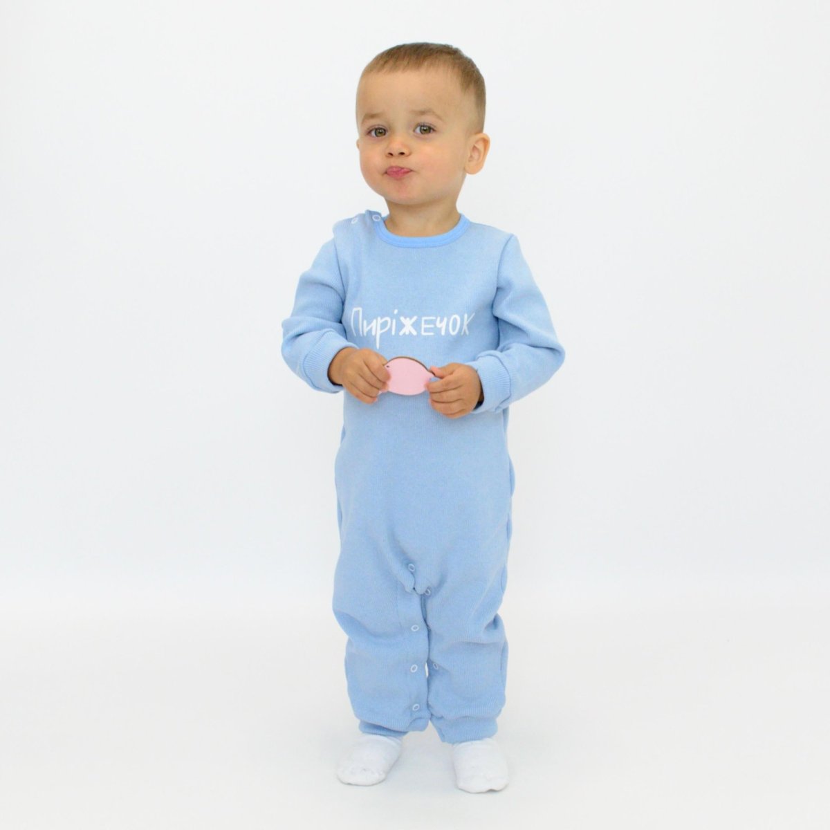 Ромпер для малюків повинен бути зручним, теплим і практичним. Представлена модель виконана з м'якого полотна рубчик з начосом блакитного кольору, яке приємне до тіла і добре утримує тепло. Така тканина особливо підходить для прохолодних днів, забезпечуючи дитині комфорт протягом усього часу носіння. Модель має лаконічний однотонний дизайн, доповнений милим написом Пиріжечок. Для зручності передбачені кнопки біля горловини і між ніжок, які значно полегшують процес переодягання і зміни підгузка. Ромпер представлений в декількох кольорах, завдяки чому можна вибрати варіант на свій смак.