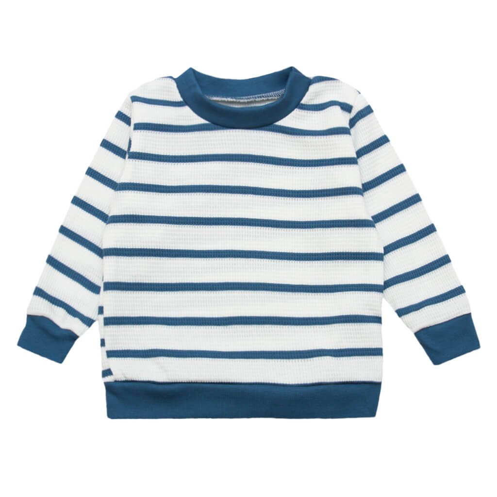 Дитячий джемпер молочного кольору в блакитну полоску з м'якого вафельного трикотажу стане зручним і стильним доповненням до гардероба малюка. Матеріал приємний до тіла, добре пропускає повітря і не сковує рухів, даючи змогу дитині грати і рухатися з комфортом. Вільний крій забезпечує зручну посадку, а еластичні манжети контрастного кольору надають моделі оригінального вигляду. Завдяки універсальному дизайну джемпер легко комбінується з різними варіантами одягу: він має чудовий вигляд із джинсами, трикотажними штанами, спортивними штанами або навіть шортами.