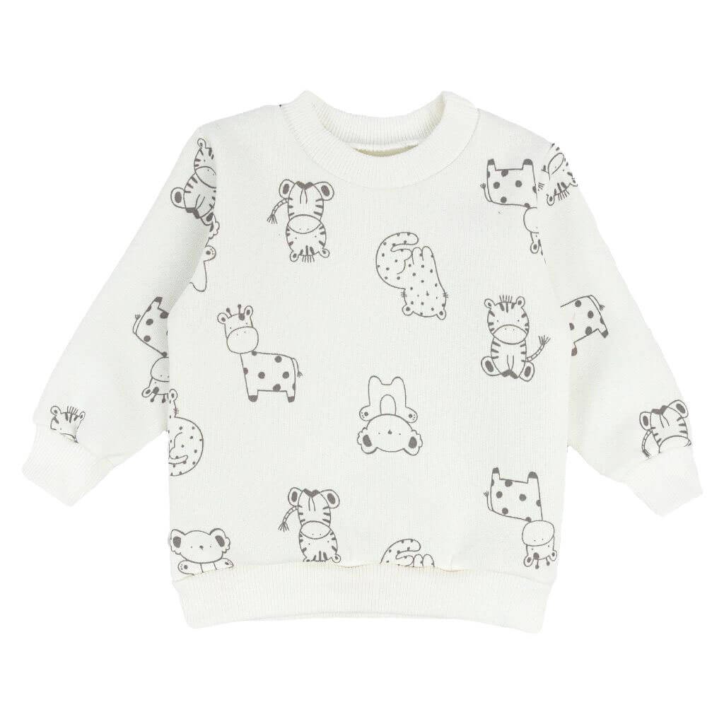 У холодну пору року дуже важливо мати в гардеробі малюка декілька утеплених кофтинок. Дана модель кофти молочного кольору для найменших виготовлена з якісної трьохнитки - це досить щільний трикотаж, утеплений зсередини. Світшот має милі малюнки по всьому периметру. Однотонний стрейч на горловині, рукавах та знизу гармонійно підходить до основного полотна. В нашому інтернет-магазині Ви також можете підібрати штанці до цього реглану або одразу придбати комплект. Якщо у Вас виникнуть труднощі з підбором розміру, наші менеджери завжди допоможуть Вам!