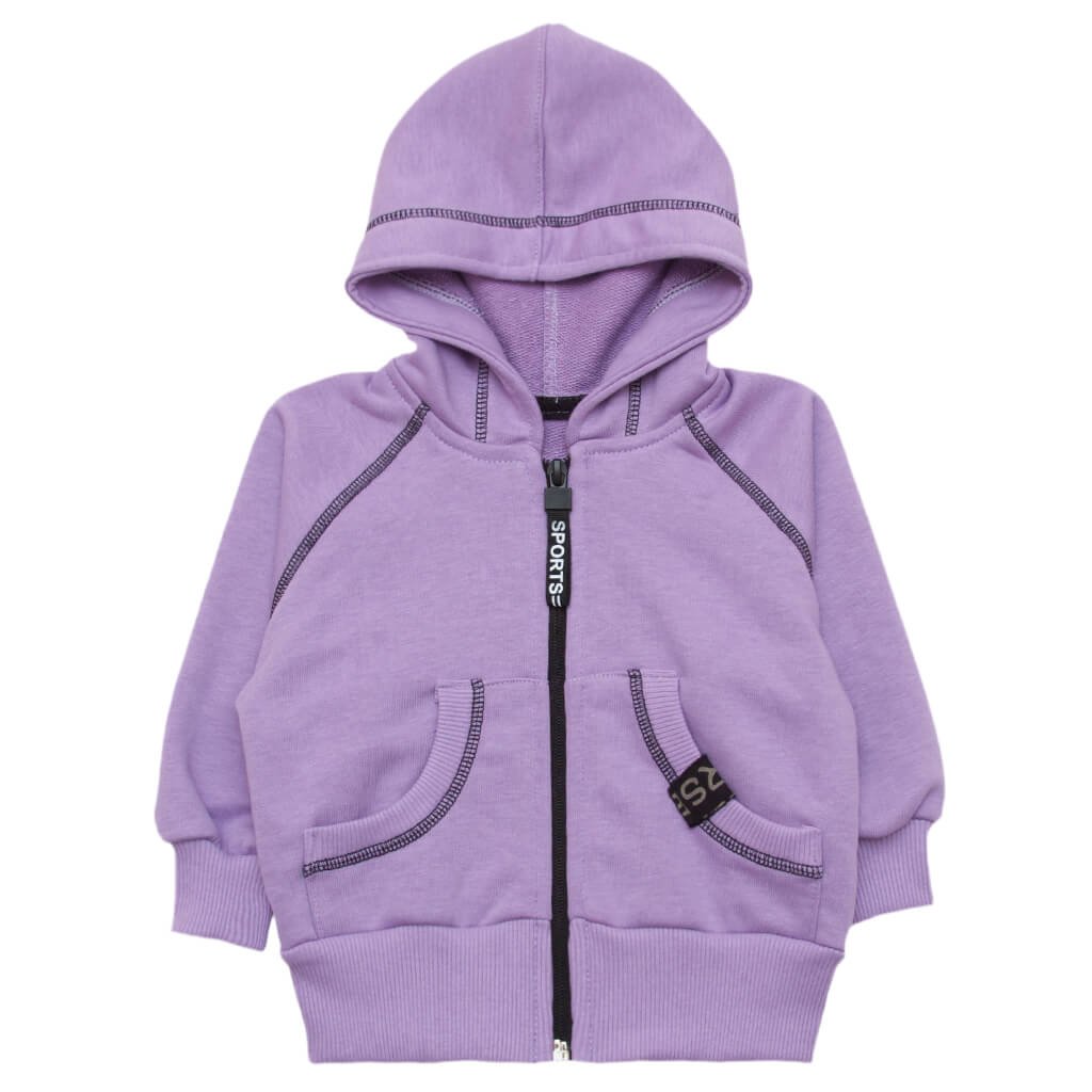 Кофта-курточка виконана з полотна трехнить, яке має щільну структуру, але в той же час володіє м'якістю за рахунок основної бавовняної нитки. Дана модель має капюшон і дві кишені-кенгуру. Кофта лавандового кольору застібається на блискавку. Манжети виконані з якісного і красивого матеріалу рубчик. Всі шви відстрочені контрастною ниткою, що надає виробу привабливий вигляд. Різноманітність кольорів не залишать байдужим жодного з батьків, а діти по достоїнству оцінять зручність цієї модельки.