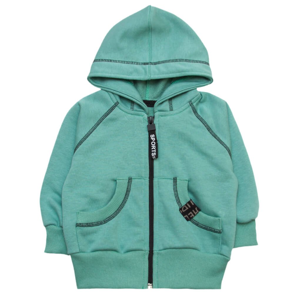 Кофта-курточка виконана з полотна трехнить, яке має щільну структуру, але в той же час володіє м'якістю за рахунок основної бавовняної нитки. Дана модель має капюшон і дві кишені-кенгуру. Кофта оливкового кольору застібається на блискавку. Манжети виконані з якісного і красивого матеріалу рубчик. Всі шви відстрочені контрастною ниткою, що надає виробу привабливий вигляд. Різноманітність кольорів не залишать байдужим жодного з батьків, а діти по достоїнству оцінять зручність цієї модельки.