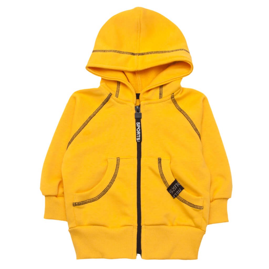 Кофта-курточка виконана з полотна трехнить, яке має щільну структуру, але в той же час володіє м'якістю за рахунок основної бавовняної нитки. Дана модель має капюшон і дві кишені-кенгуру. Кофта застібається на блискавку. Манжети виконані з якісного і красивого матеріалу рубчик. Всі шви відстрочені контрастною ниткою, що надає виробу привабливий вигляд. Різноманітність кольорів не залишать байдужим жодного з батьків, а діти по достоїнству оцінять зручність цієї модельки.