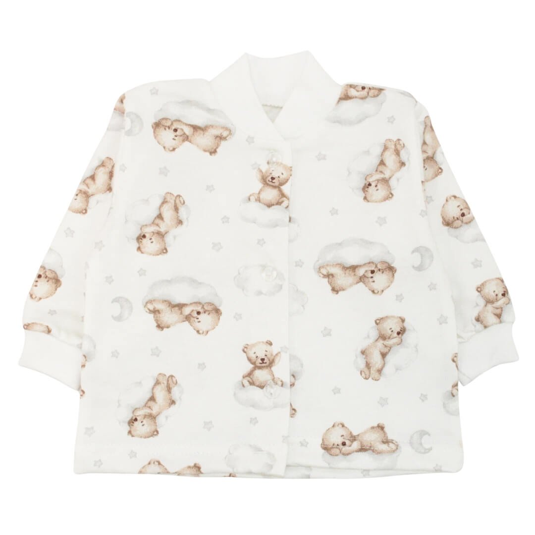 Кофтинка для малюків виконана з м'якого полотна з начосом молочного кольору з принтом ведмедиків, яке приємно відчувається на шкірі та підходить для щоденного використання. Матеріал зберігає форму, не грубіє після прання і залишається акуратним навіть при активному носінні. Кофтинка застібається на ґудзики спереду, що робить процес одягання швидким і зручним, особливо для малюків. Продуманий крій не обмежує рухи дитини і дозволяє відчувати себе вільно під час сну, ігор або прогулянок. Така кофтинка легко поєднується з повзунками, штанцями або комбінезонами, стаючи універсальною частиною дитячого гардеробу.