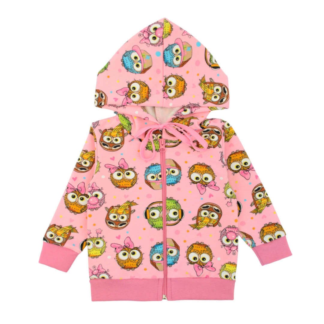 Тепло і затишок можуть бути стильними – саме так можна описати цю дитячу кофту. Виконана з якісного полотна двонитка рожевого кольору з принтом совушек, вона забезпечує комфортну посадку та приємні тактильні відчуття. Зручна блискавка по центру робить процес одягання швидким і простим, а м'які еластичні манжети на рукавах і по низу виробу допомагають зберігати тепло та фіксують кофту на місці. Зав'язки на капюшоні дозволяють надійно вкрити голову від вітру і додають особливого комфорту. Завдяки універсальному дизайну кофта відмінно поєднується з будь-якими штанцями, які ви також знайдете в нашому інтернет-магазині.