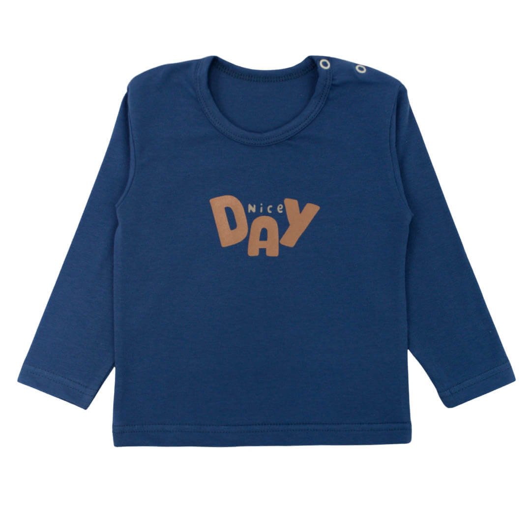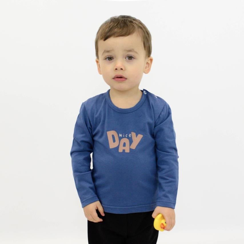 Початок дня малюка стає спокійнішим, коли одяг не відволікає і не заважає руху. Модель виконана з полотна стрейч-кулір кольору індиго з принтом Nice day - еластичного матеріалу, який м'яко лягає на тілі і добре адаптується до активності дитини. Тканина приємна до тіла, не викликає подразнення та відмінно підходить для щоденного носіння, особливо для дітей молодшого віку. Практична кнопка на плечі значно полегшує процес переодягання. Довгі рукави й продуманий крій забезпечують комфортну посадку, не створюючи відчуття стягнутості навіть під час активних рухів.