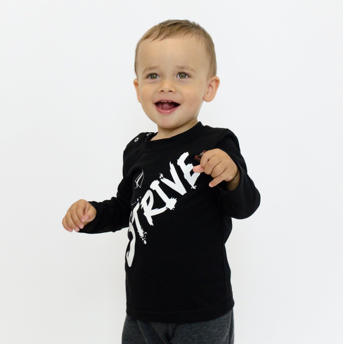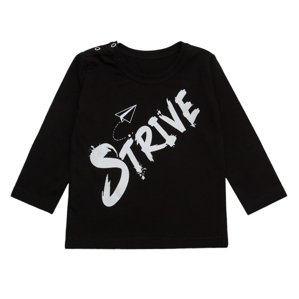 Кожен день малюка - це нові відкриття, активні ігри та маса вражень, тому комфортний одяг просто необхідний. Цей дитячий реглан чорного кольору з написом Strive створений спеціально для найменших, враховуючи всі потреби ніжної шкіри. Виготовлений з дихаючого полотна кулір, він м'який на дотик, не подразнює шкіру та ідеально підходить для носіння в демісезонний період. Кнопки на плечі значно спрощують процес переодягання, даючи змогу швидко вдягнути або зняти річ, не завдаючи дитині дискомфорту. Реглан виконаний зі стильним принтом на передній стороні, легко поєднується з іншими елементами гардероба.