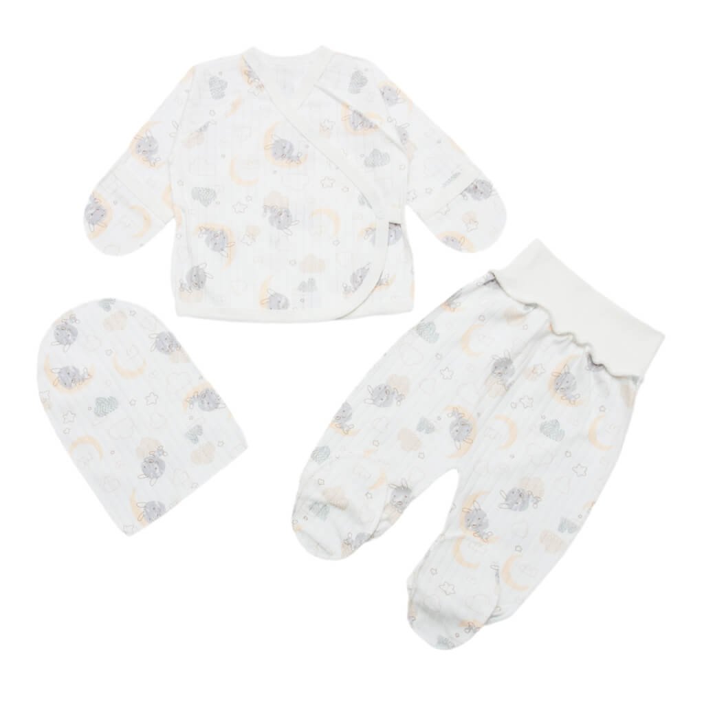Комплект для новонародженого пошитий з якісного бавовняного полотна - інтерлок раппорт. Цей матеріал полюбився багатьом матусям і став однією з найбільш затребуваних тканин для пошиття дитячого одягу. Полотно дуже приємне і м'яке на дотик, завдяки чому малюк почуватиметься максимально затишно і комфортно. Комплект складається з повзунків, сорочечки та шапочки, всі вироби мають милий принт у вигляді малюнків зайчика на місяці. Шви виконані назовні, щоб малюкові нічого не спричиняло дискомфорт і не натирало. Сорочечка застібається на дві кнопочки. Повзунки виконані на широкій резинцы, яка відмінно зафіксує виріб на дитині.