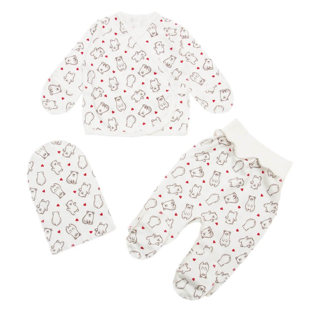Комплект для новонародженого пошитий з якісного бавовняного полотна - інтерлок раппорт молочного кольору з принтом ведмедиків. Цей матеріал полюбився багатьом матусям і став однією з найбільш затребуваних тканин для пошиття дитячого одягу. Полотно дуже приємне і м'яке на дотик, завдяки чому малюк почуватиметься максимально затишно і комфортно. Комплект складається з повзунків, сорочечки та шапочки, всі вироби мають милий принт у вигляді малюнків сердечок. Шви виконані назовні, щоб малюкові нічого не спричиняло дискомфорт і не натирало. Сорочечка застібається на дві кнопочки. Повзунки виконані на широкій резинцы, яка відмінно зафіксує виріб на дитині.