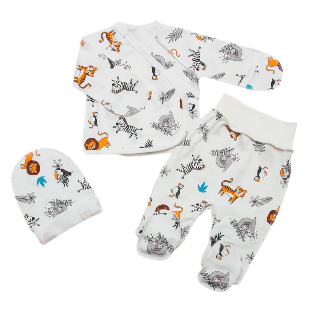 Дитячий комплект із високоякісного бавовняного полотна - ідеальний вибір для малюків. Представлена модель дитячого комплекту складається з сорочечки, повзунків і шапочки білого кольору з малюнком сафарі. Тканина, з якої пошиті вироби, на 100% складається з натуральної бавовни, і вона абсолютно безпечна для малюків. Ручки на сорочечці та ніжки на повзунках закриті, для повної безпеки та комфорту дитини. Сорочечка зав'язується на мотузочки, а повзунки зафіксуються на тілі завдяки м'якій резинці на поясі. Комплект виконаний у красивих і приємних кольорах, які підійдуть як хлопчикові, так і дівчинці.