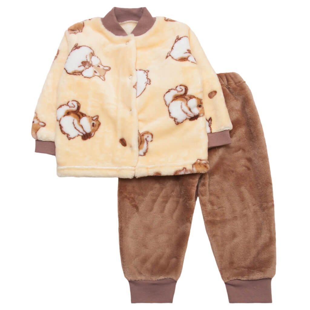 Дитячий кремовий костюмчик принт бурундуки з махри велсофт - неймовірно теплий варіант, який ідеально підходить для холодної пори року. Такий костюм можна використовувати як піжамку, домашній костюм або для щоденних прогулянок. Кофточка застібається на кнопках, на рукавах манжети, що підходять за кольором до основної тканини. Штанці також з манжетами, резинка на поясі м'яка та еластична, чудово тягнеться та зберігає форму. Такий махровий костюм обов'язково повинен з'явитися в гардеробі малюка, адже в ньому дитині буде тепло і затишно навіть у люті морози.