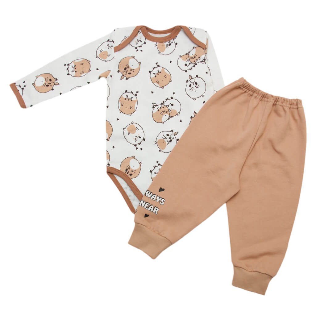 Комплект бодіка з довгим рукавом та штанців стане незамінною річчю в гардеробі Вашого малюка. Вироби виготовлені з високоякісного начісного полотна, у складі якого присутня натуральна бавовна. Горловина боді виконана у вигляді "човника", застібається виріб на кнопочки, які розташовані між ніжок. Штанці на м'якій резиночці. Боді пошито з тканини бежевого кольору з малюнком хом`ячків, а однотонні штанці доповнені невеликим фарбуванням на передній стороні. Такі комплекти дуже зручні та універсальні. Крім того, що вони вже створюють цілісний образ, вироби також можна носити й окремо.