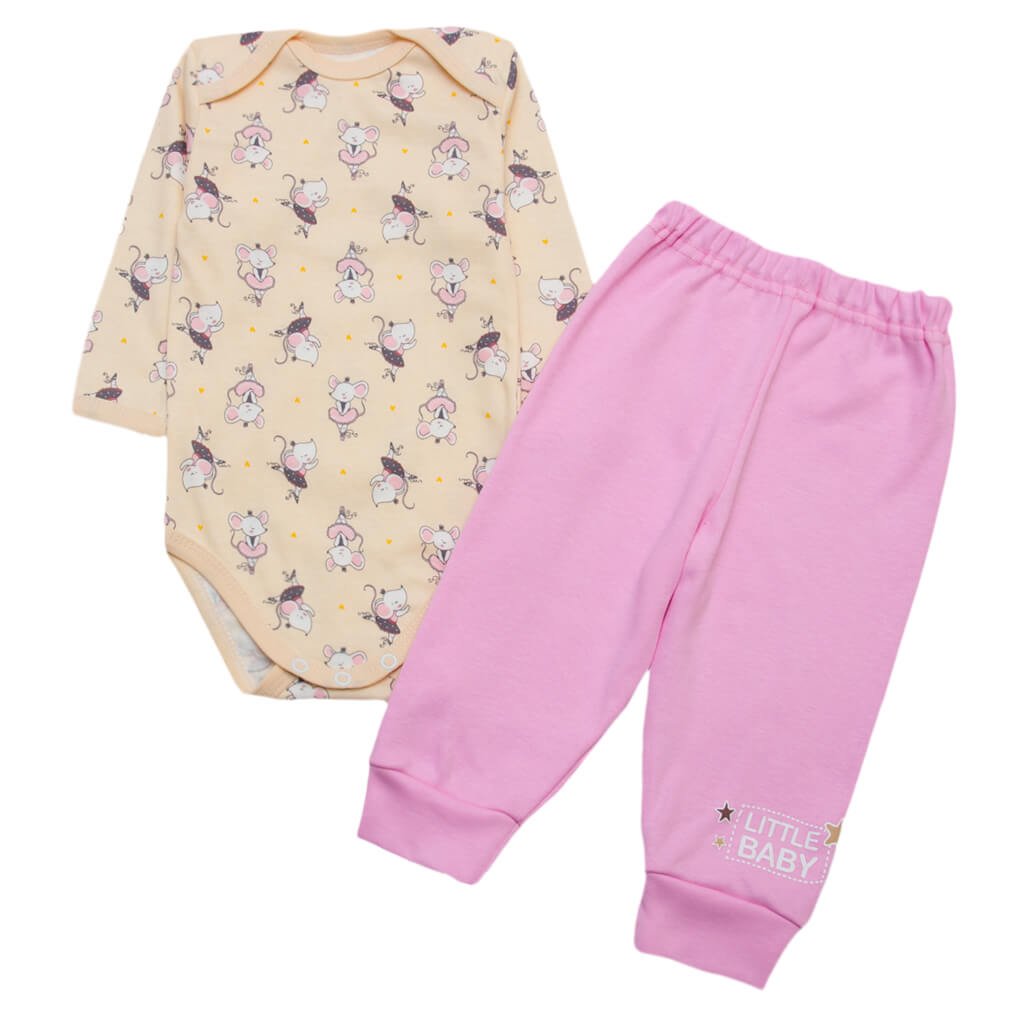 Новий комплект боді жовтого кольору з принтом мишенят з довгим рукавом та штанців виготовлено з високоякісного полотна - інтерлоку. Полотно не тільки м'яке і приємне на дотик, але й міцне, що особливо важливо для активних малюків. Також тканина інтерлок повністю гіпоалергенна і завдяки цьому безпечна для дитячої шкіри. Боді зручно застібається на кнопочки між ніжок, а також має горловину у вигляді "човника". Однотонні штанці рожевого кольору виконані на м'якій еластичній резинці, а також прикрашені милим фарбуванням. Такий комплект стане прекрасним варіантом для повсякденного носіння.
