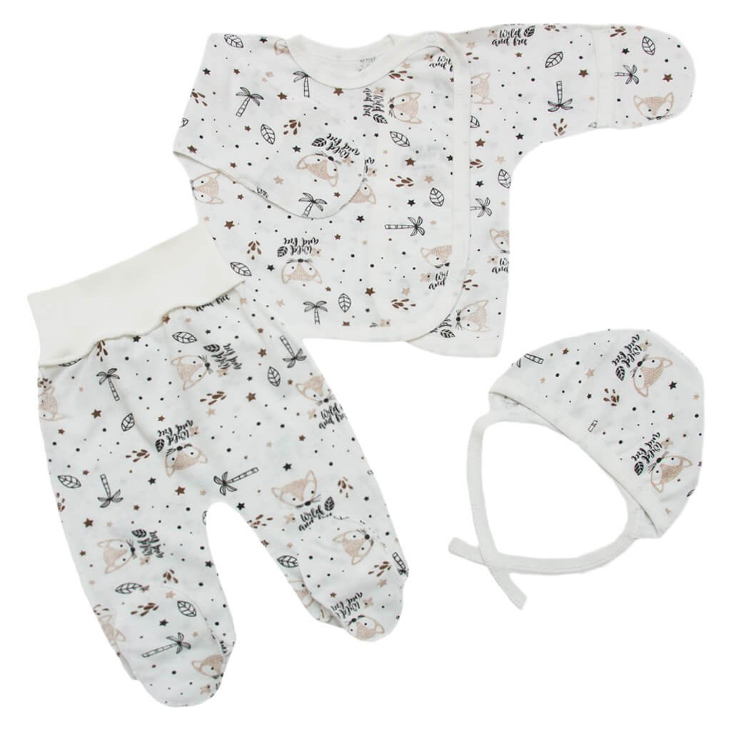Комплект дитячий виготовлений з бавовняного полотна - кулір. Данний комплект білого кольору з малюнком лисичок, складається з трьох речей: сорочечка, єврики і чепчик. Сорочечка - на запах, застібається на кнопки на плечиках. Єврики зі стоячою ніжкою, на поясі - широкий і еластичний манжет, який не буде здавлювати і натирати животик малюка. Чепчик - на зав'язочках. Всі шви в комплекті виконані навиворіт. Замовте такий комплект для свого малюка в нашому інтернет-магазині і Ви неодмінно залишитеся задоволені якістю і зовнішнім виглядом. Приємних покупок!