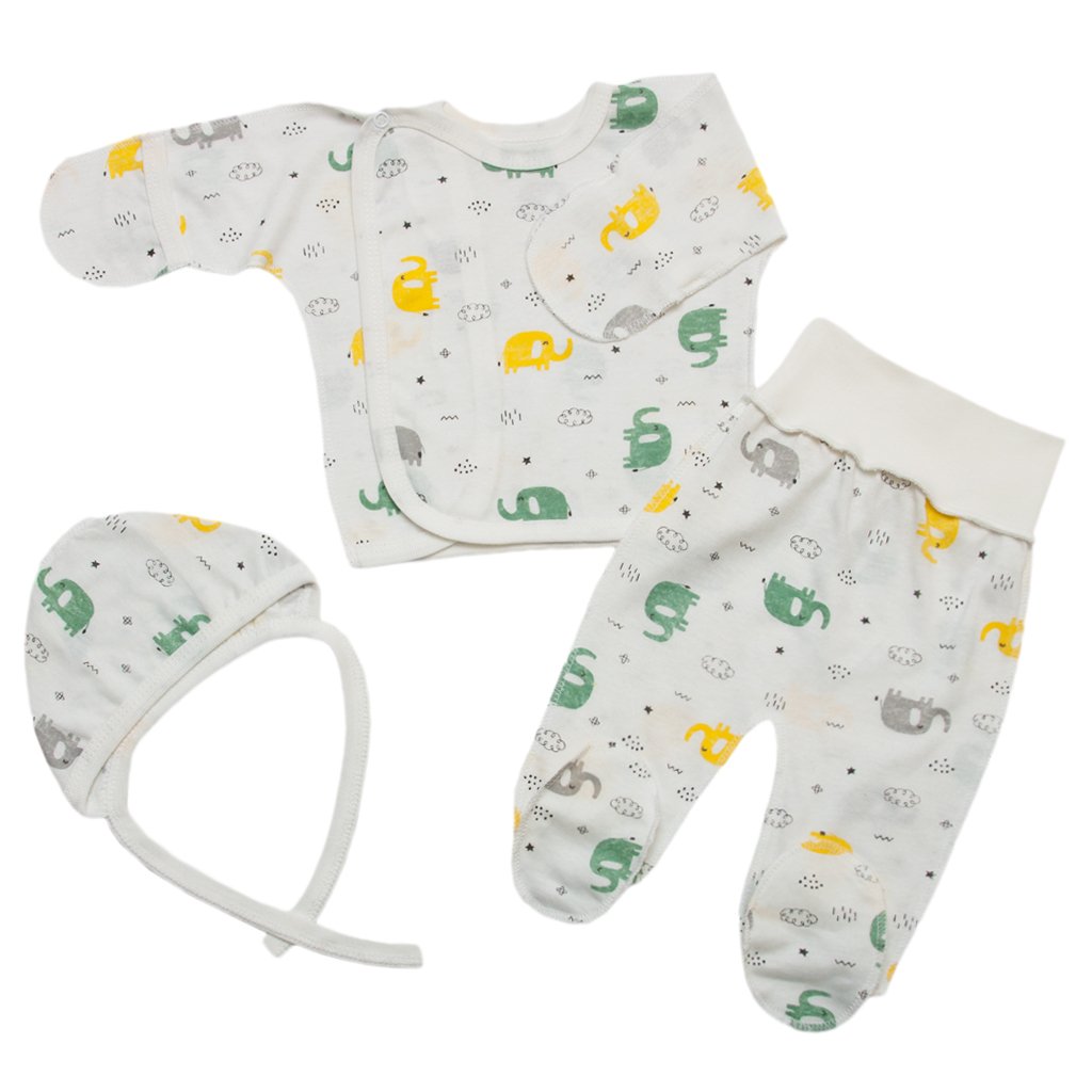 Комплект дитячий виготовлений з бавовняного полотна - кулір. Данний комплект білого кольору з малюнком слоників, складається з трьох речей: сорочечка, єврики і чепчик. Сорочечка - на запах, застібається на кнопки на плечиках. Єврики зі стоячою ніжкою, на поясі - широкий і еластичний манжет, який не буде здавлювати і натирати животик малюка. Чепчик - на зав'язочках. Всі шви в комплекті виконані навиворіт. Замовте такий комплект для свого малюка в нашому інтернет-магазині і Ви неодмінно залишитеся задоволені якістю і зовнішнім виглядом. Приємних покупок!