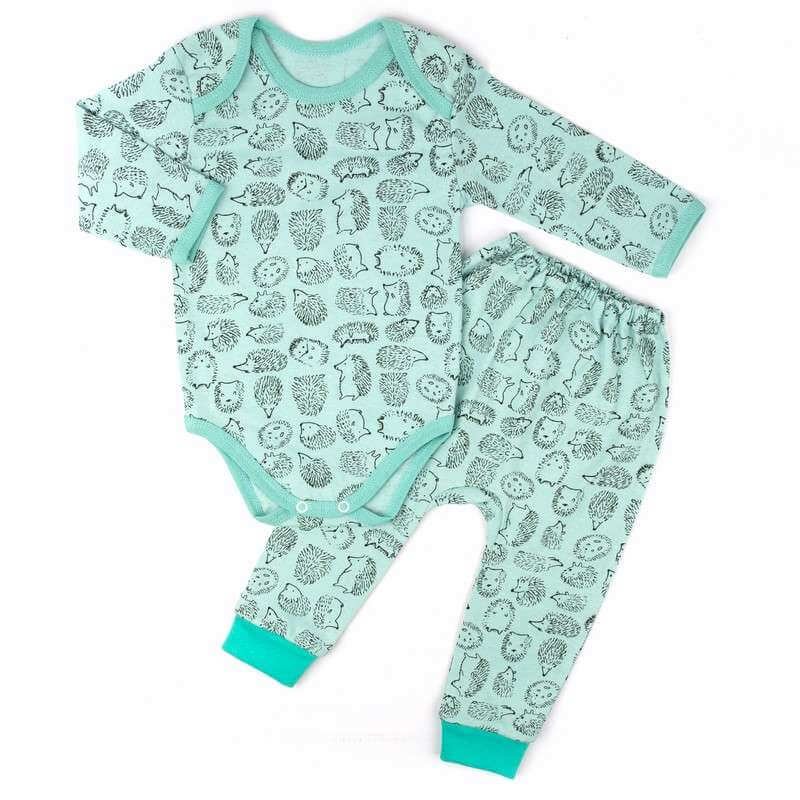 Багато батьків знають, що одним з найзручніших одягів для малюків є боді. Такі вироби відмінно прилягають до тіла дитини, не задираються та не доставляють дискомфорту. Нова модель бірюзового дитячого комплекту складається з боді з довгим рукавом та штанців на м'якій резинці. Вироби пошиті з високоякісного куліра, який на 100% складається з натуральної бавовни. Також на полотні є різні малюнки. Верх боді виконаний у вигляді «човника». А низ виробу застібається на кнопочки. По низу штанців присутні еластичні манжети.