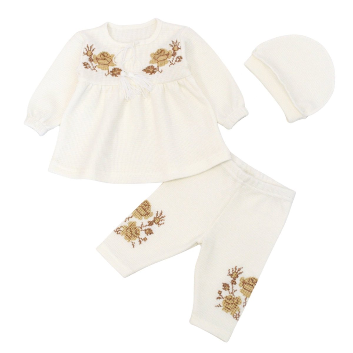 Для найменших важливі і зовнішній вигляд, і зручність, і даний комплект вдало поєднує обидві ці якості. Він виконаний з м'якого полотна інтерлок вафелька молочного кольору, яке приємне на дотик, добре пропускає повітря та підходить навіть для найчутливішої шкіри. У набір входять туніка з довгими рукавами, прикрашена вишивкою з квітковим малюнком, зручні штанці з таким же візерунком і шапочка, що забезпечує додаткове тепло. Еластична резинка на поясі штанців м'яко фіксує їх, не сковуючи рухів дитини. Застібка на зав'язки робить туніку зручною для переодягання.
