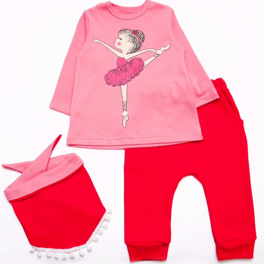 Всі дівчатка хочуть виглядати стильно і навіть найменші принцеси не виняток. Ми враховуємо всі ці фактори і випускаємо нову модель стильного комплекту для дівчинки. Комплект виготовлений з натурального бавовняного м'якого, ніжного інтерлочного полотна. Комплект комбінований двома кольорами і складається з персикової кофтинки, червоних штанців і червного хомута. Кофточка має кнопочки на одному плечику, рукава і низ оброблені распошивом. На штанцях по низу манжети. У поясі резиночка і є два не великі кишені. Також є хомут, який просто зав'язується. На хомуті є тісьма яка виглядає дуже стильно.