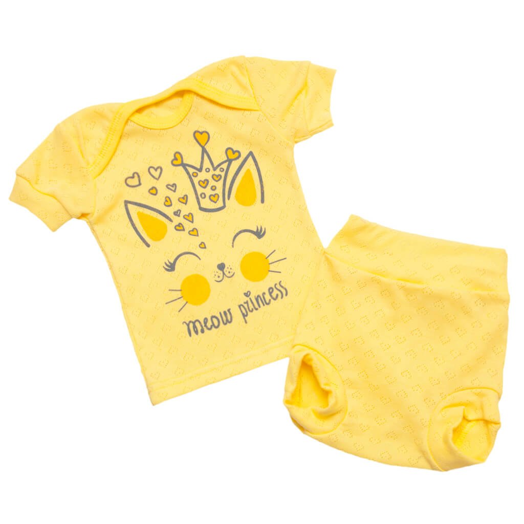 Літній і барвистий комплект жовтого кольору для дівчинки виготовлений з бавовняного полотна - рібана жаккард. Комплект однотонний і складається з футболочки і трусиків під памперс. Горловина на футболці виконана в формі "човники". Попереду - прикрашена милою і веселою покраскою, яка неодмінно сподобається вашій дитині. Манжети на комплекті оброблені крошеттою. Комплект з якісного і легкого полотна, яке добре пропускає повітря і малятку буде комфортно в ньому. А ви залишитеся задоволені якістю. Приємних покупок!