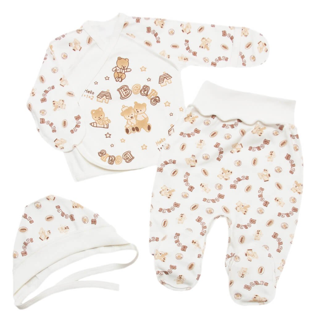 У маленьких дітей шкіра дуже ніжна і тому правильно підібраний одяг захистить їх від подразнень та алергії. Комплект ясельний виготовлений з високоякісного бавовняного інтерлкового полотна. Комплект складається з трьох предметів: кофточка, євро-повзунки та шапочка. Кофточка комбінована з двох кольорів полотна. На поличці – фарбування. Кофта з довгим рукавом. Внизу рукав з кишенькою "анти дряпка". Кофточка на запах із застібкою на кнопці. На євро-повзунах ніжка "стійки". Пояс широкий, усередині вставлена еластична тасьма. Шапочка комбінована з двох кольорів із зав'язками. У такому комплекті Ваша дитина почуватиметься комфортно.