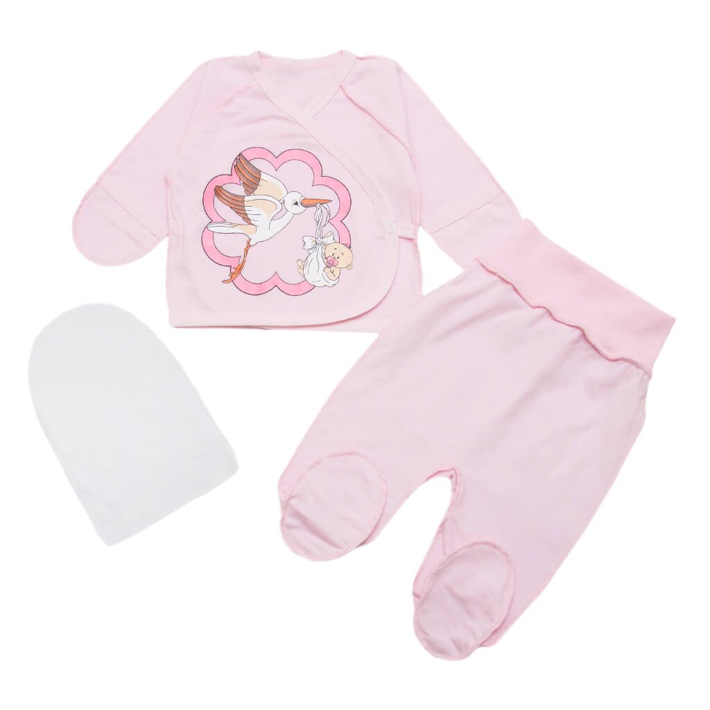 Новий комплект для малюків від ТМ Арлекин - ідеальне рішення для дбайливих батьків, які прагнуть забезпечити своєму малюкові максимальний рівень комфорту та зручності. Представлений комплект виготовлений з якісного матеріалу - кулір світло-рожевого кольору, який повністю складається з натуральної та гіпоалергенної бавовни. У комплект входить сорочечка на запах, повзунки з широким еластичним поясом і шапочки. Завдяки високій якості полотна, всі вироби подарують Вашому малюку максимальне відчуття комфорту та затишку. Комплект представлений в декількох приємних кольорах, а на сорочечці є миле фарбування лелеки.