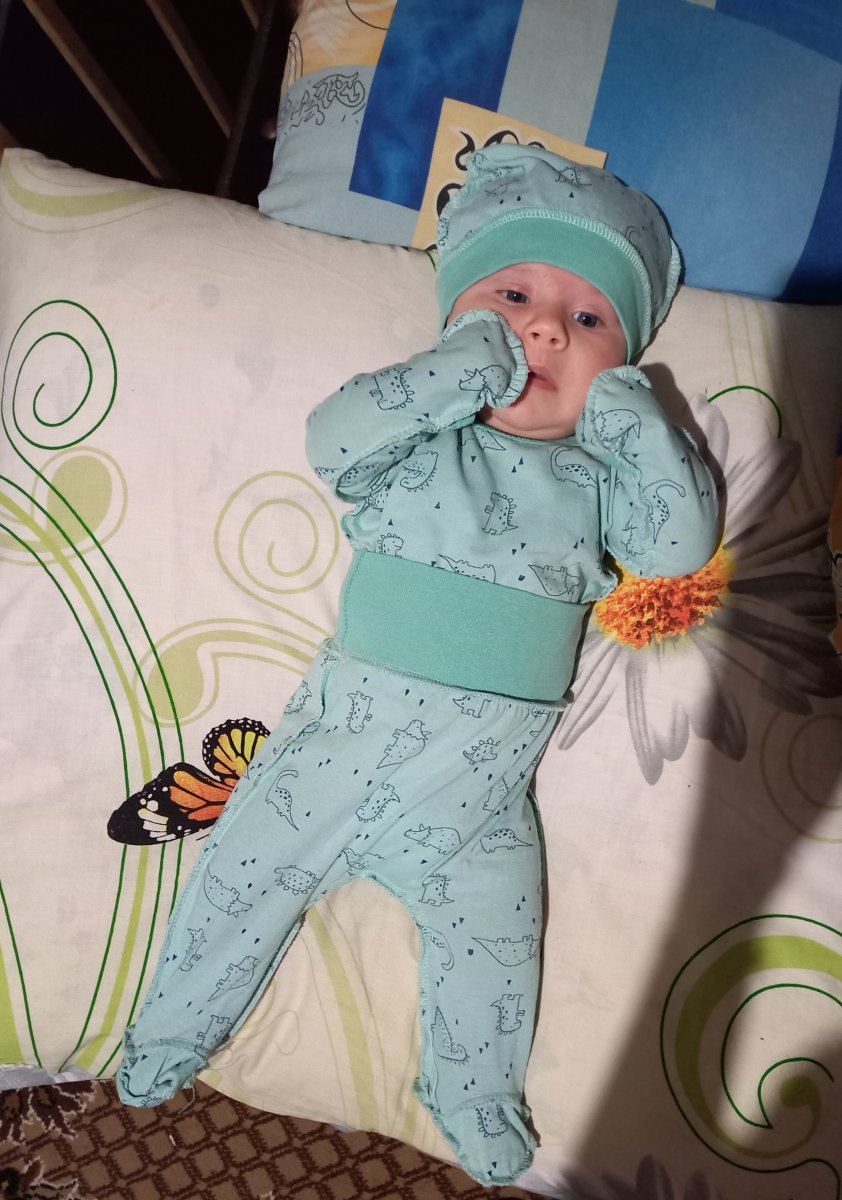 Ясельний комплект для дівчинки з бавовняного натурального інтерлочного полотна, рожевого кольору, принт веселка. Матеріал ніжний і м'який, не викликає алергії навіть у самих маленьких діток. Комплект складається з сорочечки, шапочки і плазунів. Льоля по колу оброблена бейкою підібраною в тон полотна. На рукавах антіцарапки, і є дві кнопочки. Повзуночки по поясу на манжеті, ніжки закриті. Шапочка також на манжеті. У цьому комплекті всі шви виконані назовні, ніжній шкірі маляти нічого не буде заважати і тиснути, що дуже важливо для новонароджених.
