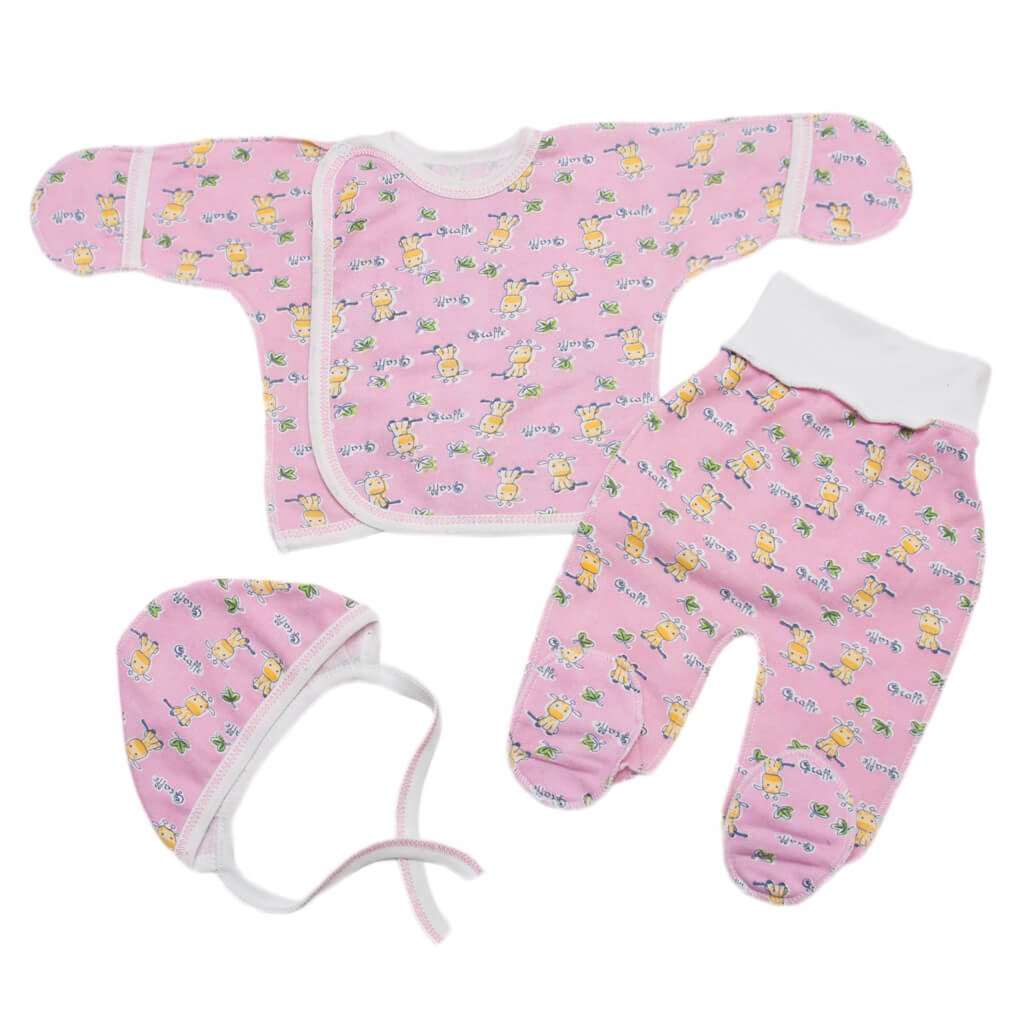 Вашій увазі представляємо рожевий комплект, принт жирафа для новонароджених дівчаток з унікальним дизайном і відмінною якістю виконання. У комплект входить стандартний набір складається з сорочечки, повзунів і чепчика. Сорочечка виконана в оригінальному вигляді: права сторона розташована в нахлист з застібками у вигляді кнопок, що вбереже вашу дитину від подряпин. Повзуни з широкою резинкою під памперс будуть дуже зручні. Чепчик прекрасно приймає форму голови, а матеріал пошиття не приноситиме дискомфорту під час сну.