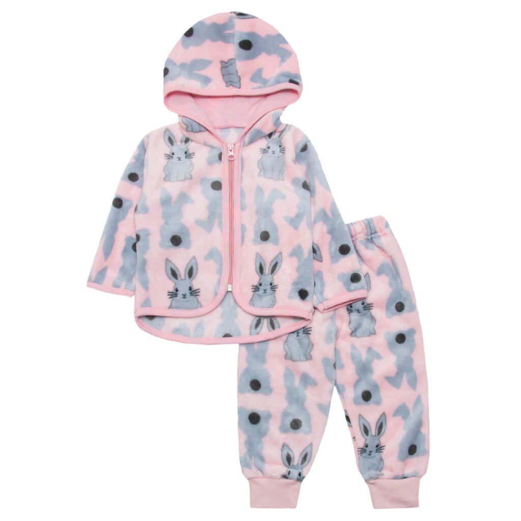Комплект для дівчинки пошитий з махрового полотна, рожевого кольору, принт зайчики. Таке полотно добре зарекомендувало себе у використанні дитячого одягу і не лише. Махра користується великим попитом через свої якості. У виробах з такого полотна тепло, до того ж вони кашлатятся і не втрачають форму після прання. У комплекті є кофтина і штанці. Всі краї кофтини оброблені руликом, підібраним в колір полотна. Спереду кофта застібається на блискавку. Також на кофтині є капюшон, що теж зручно. На штанцях по низу манжети із стрейча, в поясі еластична резинка.