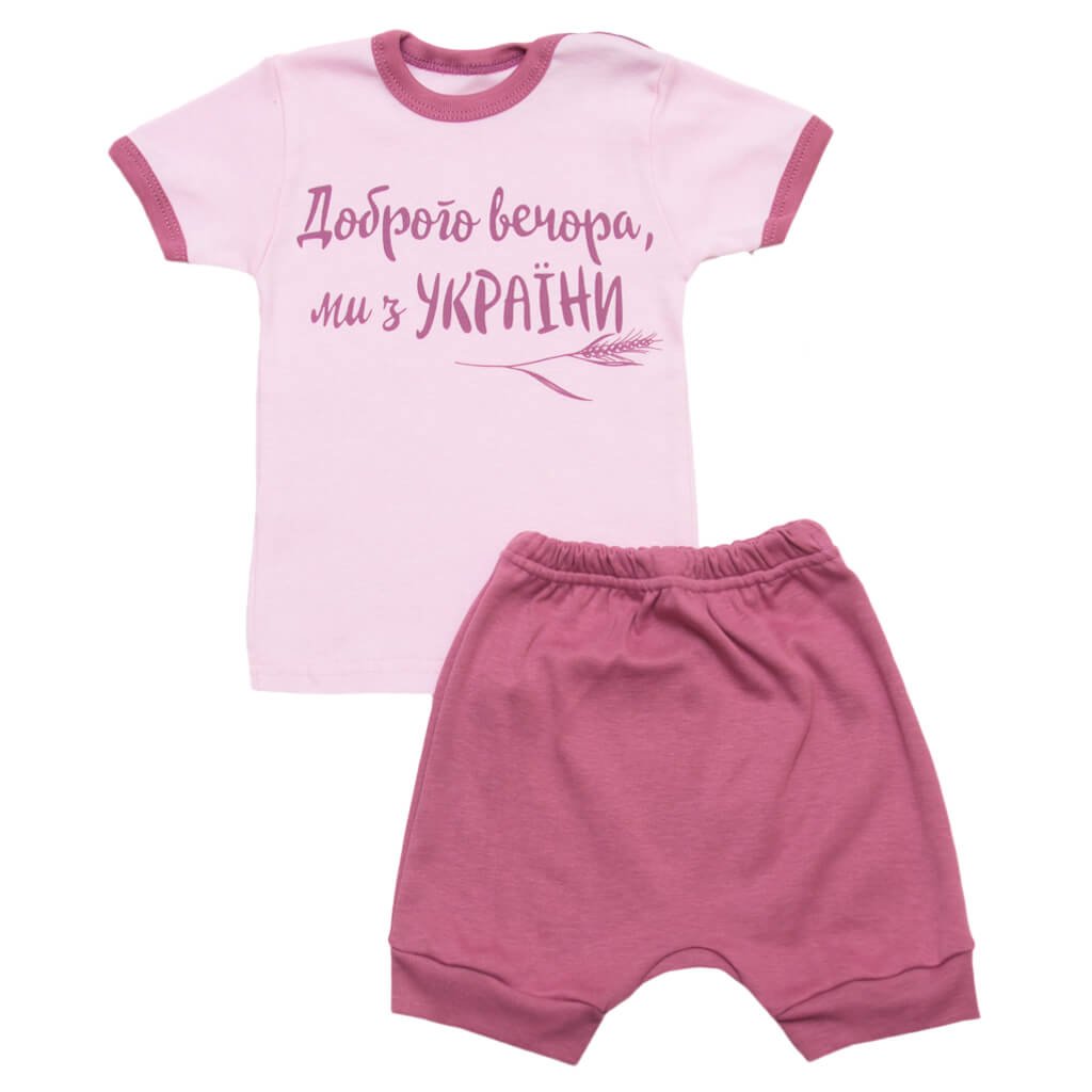 Дитячі комплекти футболок та шортиків - чудовий варіант зручного літнього одягу, який виглядає неймовірно стильно, за рахунок відмінного поєднання виробів між собою. Гарний дитячий комплект Ви зможете придбати у нашому інтернет-магазині ТМ Арлекин. Футболка та шортики виготовлені з високоякісного та гіпоалергенного матеріалу – рібани. Краї рожевої футболочки оброблені бейкою, а на одному плічку розташовані невеликі кнопочки. Також футболочку прикрашає гарний патріотичний напис. Шортики на м'якій резинці забезпечать максимальний комфорт Вашому малюкові.