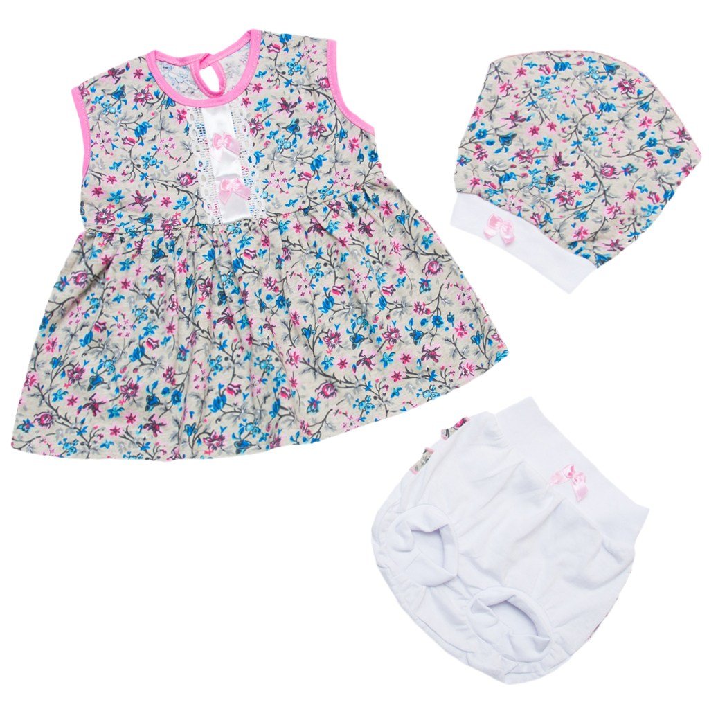 Комплект "трійка" для дівчинки складається з плаття, косинки і трусиків під памперс. Вироби виготовлені з легкого, "дихаючого" полотна - кулір - це полотно на 100% складається з бавовни, ідеально на літо. Платтячко без рукавів, від животика розкльошене, ззаду зверху зав'язується, завдяки цим зав'язкам плаття легко буде надіти на крихітку. Косинка без зав'язок і застібок, тримається на еластичній резинці зі стрейча. Резинка добре тягнеться і не буде здавлювати голову дитині. Білі трусики під памперс ззаду прикрашені двома горизонтальними смужками-рюшами в колір сукні і косинці. Також всі вироби декоровані милим бантиком. Такий комплект можна носити як разом, так і окремо, поєднуючи з іншими виробами нашого інтернет-магазину.